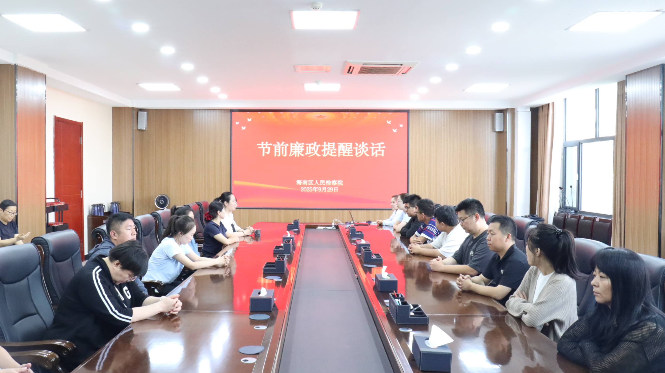 金秋送爽,丹桂飘香,国庆、中秋佳节将至。为深入贯彻中央八项规定精神,持续巩固深化作风建设成果,营造风清气正、文明祥和的节日氛围,9月29日,海南区人民检察院召开节前集体廉政提醒谈话会议。